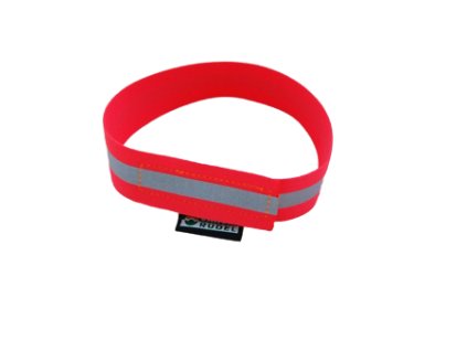 Reflexní gumová 35 mm široká páska (obojek) sešitý s nastavitelným obvodem od 500 do 700 mm.